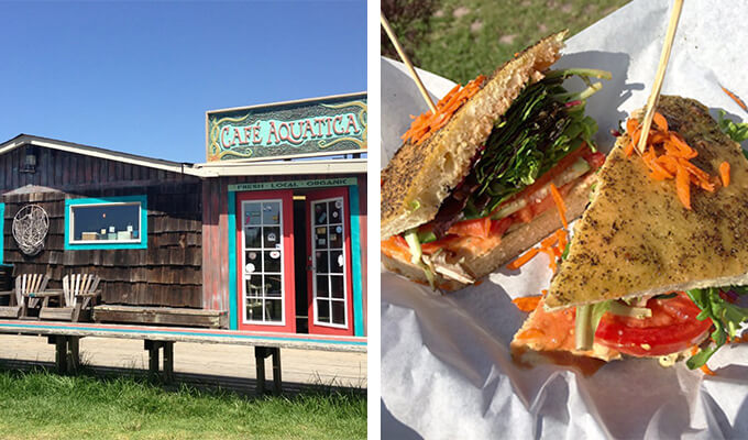 Where the Russian River meets the Pacific, Aquatica perches on the shore with a lovely view.The small cafe offers sandwiches, cookies and pastries, and coffee of course.